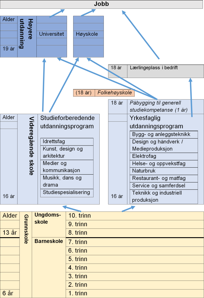 Початкова школа та середня школа складають так звану «grunnskole». Початкова школа є обов'язковою для всіх дітей у Норвегії. Усі діти, які залишаються в Норвегії більше трьох місяців, мають право і зобов'язані відвідувати школу.