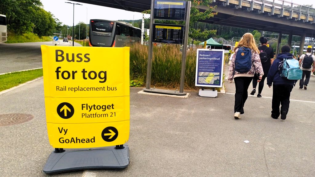 На всіх ділянках, де тривають роботи, курсують спеціальні автобуси. Зупинки позначені жовтими табличками «Buss for tog», а на великих станціях працюють консультанти, які допомагають з навігацією.